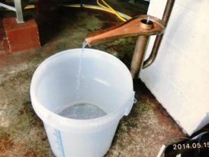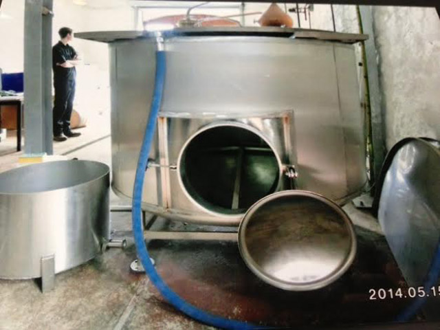 ここでは42時間ファーメンターした後、新しいマッシュタンの様な槽へ移し変えて、さらに16時間かけて発酵を進めます。発酵槽が空いたらすぐに移し変えられるよう効率も考えられているそうです。発酵の際に使用するイースト菌は、只今色々なものを考えているらしく、去年はフランスのイースト菌を使用しました。結果、とてもフルーティな香りが生まれたそうです。写真の畑は、段々畑になっており、ここに菖蒲を植えています。菖蒲の茎(根)が銅の毒を消すそうです。