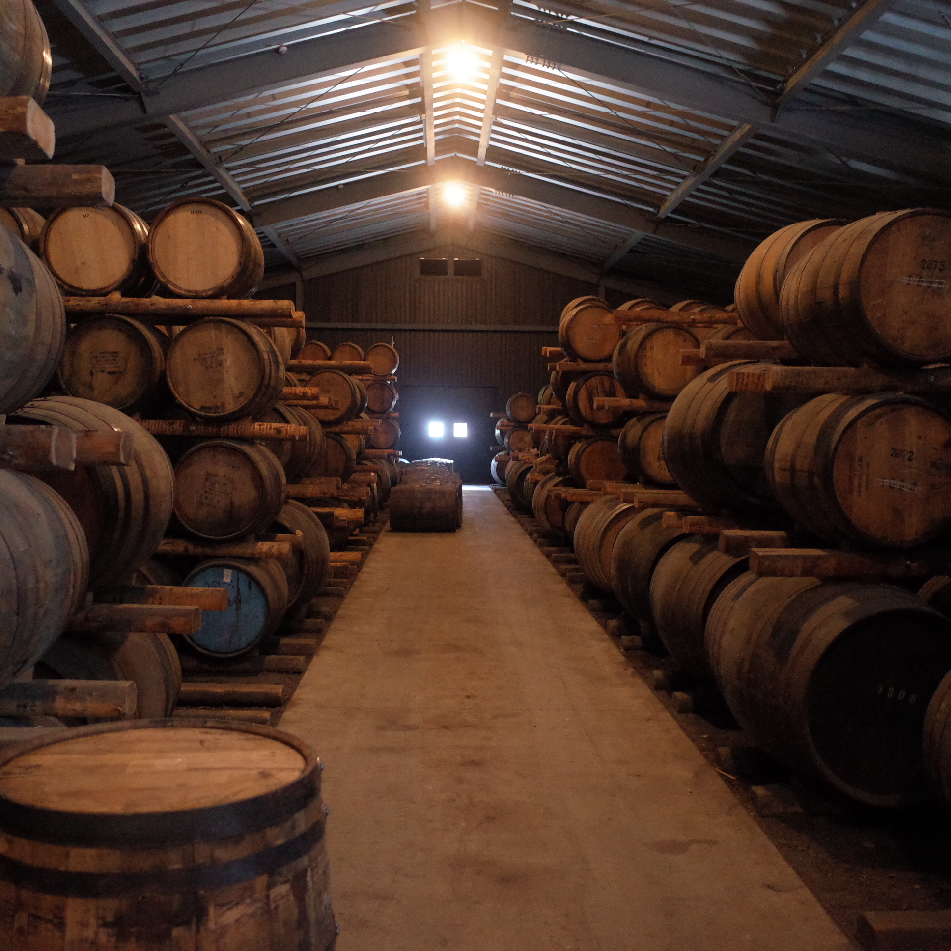 糖化、発酵、蒸留を一手に行う灼熱の建物を後に、地面の上にダンネージ式で貯蔵されている、1番セラーに参りました。